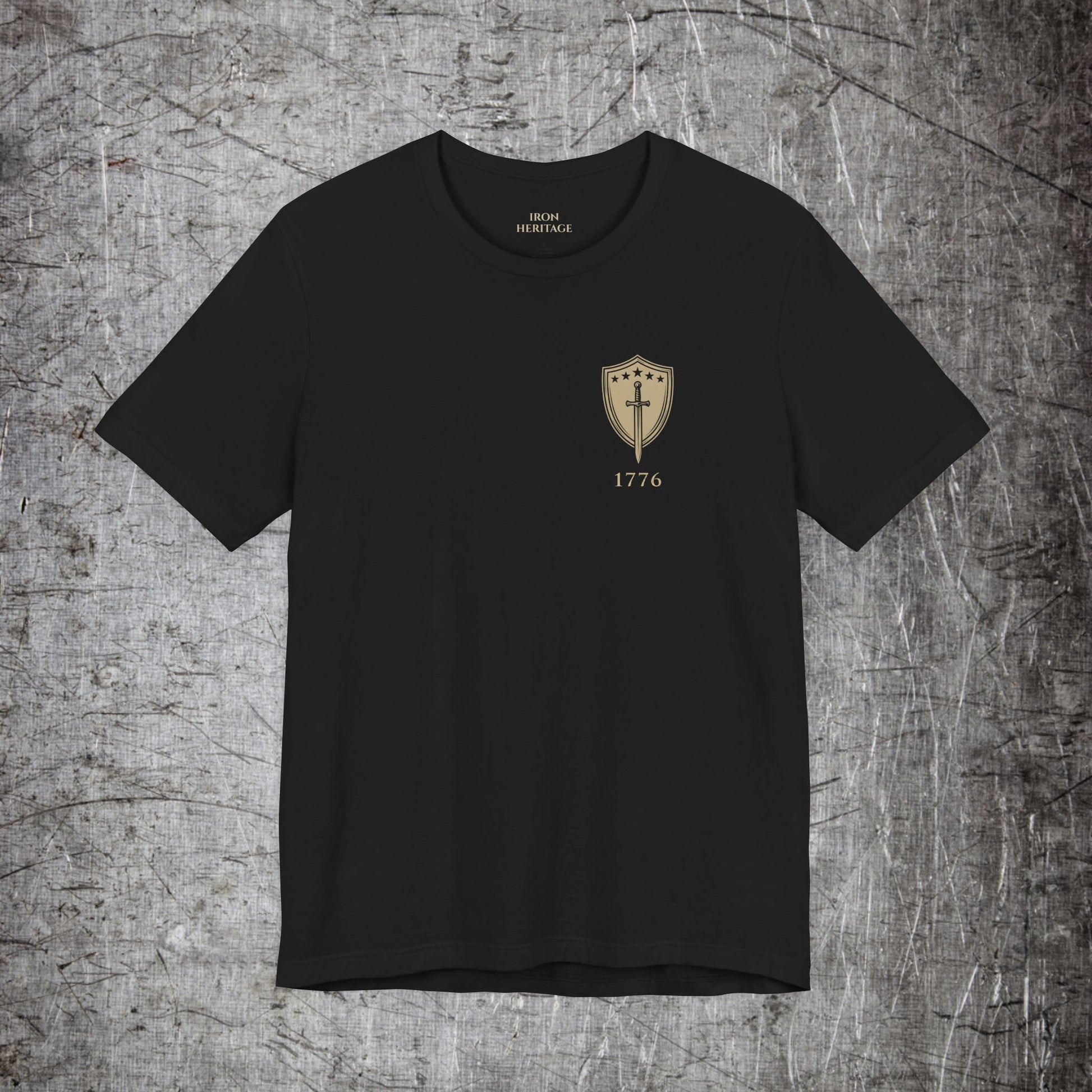 - Chest shield emblem and distressed 1776 flag print on back using crisp DTF/DTG printing options